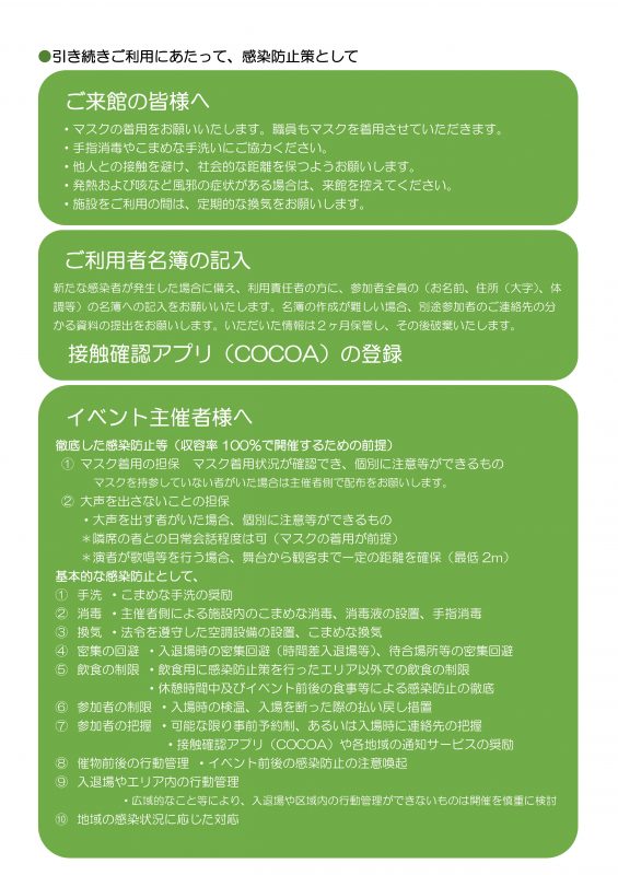 令和2年9月14日に文化庁より発表されました、「11月末までの催物の開催制限等について」に基づき、新型コロナウイルス感染予防のため、6月2日より制限を設けてまいりましたが、10月1日よりさらに利用制限を緩和いたします。